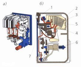 Автоматический выключатель АП - 50: а - общий вид; б - продольный разрез 1 - основание; 2 - пластмассовый корпус; 3 - неподвижный контакт; 4 - подвижный контакт; 5 - пластины дугогасительные; 6 - электромагнитный расцепитель; 7 - тепловой расцепитель