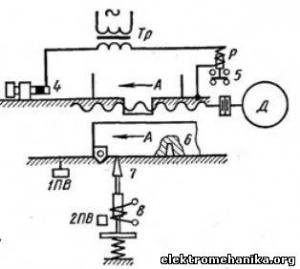 Для увеличения тормозного момента применяют электрическое торможение электродвигателей, а также механическое торможение посредством электромагнитных муфт. Более высокая точность останова может быть достигнута посредством применения жестких упоров, механически прекращающих движение. Недостатком в этом случае являются значительные силы, возникающие в частях системы при соприкосновении с жестким упором. Эти два вида торможения применяют совместно с первичными преобразователями, отключающими привод, когда давление на упор достигнет определенной величины. Движущийся узел А станка встречает на своем пути жесткий упор 4. Головка этого упора изолирована от станины станка, и при соприкосновении с нею узла А замыкается цепь вторичной обмотки трансформатора Тр. При этом срабатывает промежуточное реле Р, которое отключает двигатель. Так как в данном случае станина станка входит в электрическую цепь, то напряжение цепи понижают трансформатором Тр до 12 - 36 В. Значительную трудность представляет подбор материала, изолирующего головку электроупора. Он должен быть достаточно твердым, чтобы сохранить размер, и вместе с тем должен выдерживать значительные ударные нагрузки упора 4.