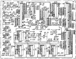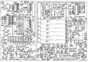Рассмотрим каждую команду. Для выбора диапазона нажимается клавиша "D" и клавиша с требуемым диапазоном. Установка любой частоты с клавиатуры осуществляется нажатием "F" и вводом значения частоты, используя клавиатуру в цифровом режиме. Для запоминания текущей частоты в одной из 10 ячеек памяти используют клавишу "IN" и одну цифровую, указывающую на номер ячейки памяти. Извлечение частоты из памяти происходит после нажатия кнопки "OUT" и одной цифровой - с номером ячейки. Перед подачей команды сканирования в ячейки памяти с номерами "0" и "9" заносят значения граничных частот диапазона сканирования. Для подачи команды нажимается кнопка "S". После небольшого поворота валкодера сканирование прекращается. Если подать команду повторно, процесс начнется с прерванного места. В памяти синтезатора имеется 8 ячеек памяти, используемых как стек. Запись текущей частоты в стек происходит автоматически в следующих случаях: при выборе нового диапазона, при извлечении частоты из ячейки, при установке частоты с клавиатуры. Возврат частоты из стека осуществляется нажатием клавиши "W". Многократно нажимая "W", можно просмотреть все частоты в стеке. Включение и выключение расстройки производится клавишей "R". Если расстройка включена в крайней левой позиции дисплея, светится знак "-". Все следующие команды действуют только при включенной расстройке. Обмен местами текущей частоты приема с дополнительной частотой приема производится клавишей "А - В". Обмен местами текущей частоты приема с частотой передачи осуществляется клавишей. "R-Т". Клавишей "T-R" можно сделать частоту передачи равной частоте приема. О требованиях к конструкции синтезатора можно прочитать в журналах "Радио" за 1990 год NN 1, 2, 3. Настройку следует начинать с проверки печатных проводников на целостность и на отсутствие замыканий между ними. Особенно тщательно эту операцию следует проводить в процессорном модуле. Так как неисправности в процессорном модуле практически невозможно определить осциллографом или тестером, рекомендуется микросхемы DD2, DD5...DD8 ставить на панельки или перец пайкой предварительно определить их работоспособность. При повторении конструкции обратите внимание, что на плате А1 вьвод 15 микросхемы DD14соединен с выводом 7 DD15. Это не опечатка. После "оживления" синтезатора скорей всего вам придется подстроить диапазоны перестройки гетеродинов. Для этого на каждом любительском диапазоне вводят с клавиатуры значения самой нижней и самой верхней частот. При этом напряжение на варикапах гетеродинов должно находиться в пределах от 1 до 9 вольт и светодиод "LOCK" должей быть погашен. В противном случае придется подобрать элементы, отмеченные на схеме звездочками.